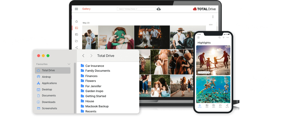 Don’t risk losing what matters, Total Drive securely syncs up your files to the cloud, keeping them safe from theft, damage, or unexpected loss.